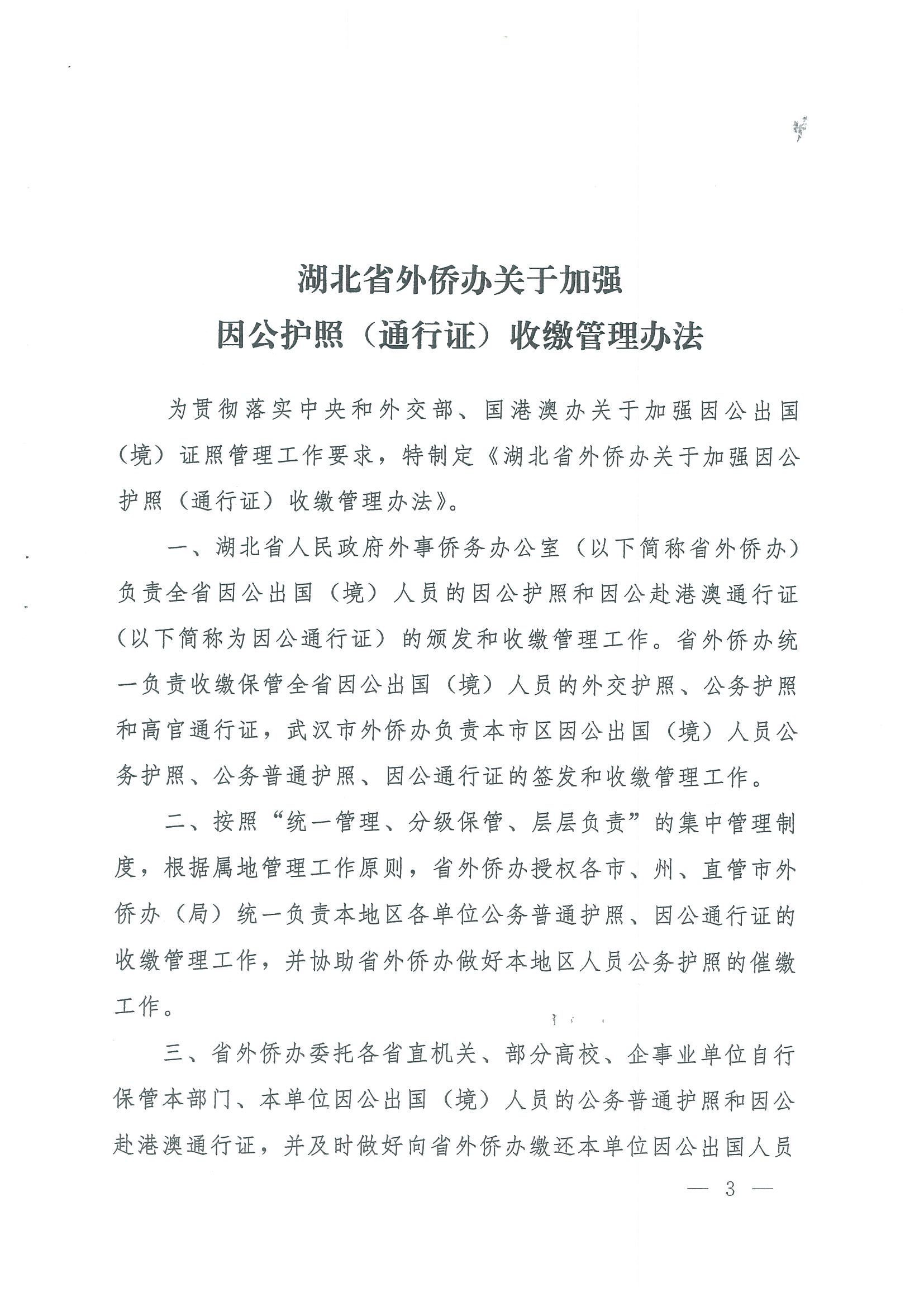 关于印发《湖北省外侨办关于加强因公护照(通行证)收缴管理办法》的通知