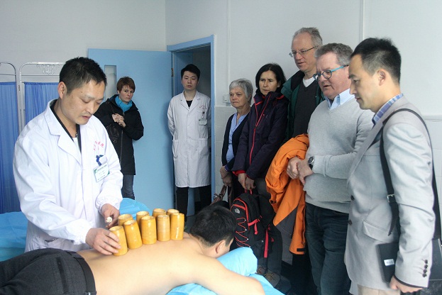Rath博士对中医也充满了兴趣,特意来到集团市中医医院参观,体验了富有中国特色的治疗方法——中医推拿和拔火罐。